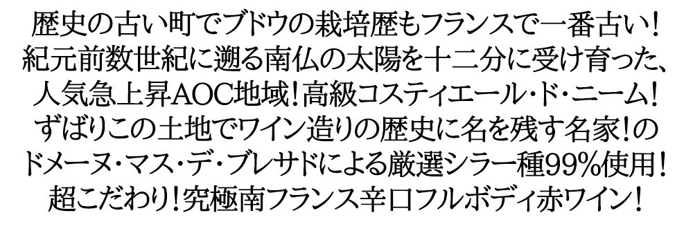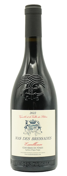 コスティエール・ド・ニーム・ルージュ・キュヴェ・エクセレンス[2022]年 ぶどう品種:シラー種99%/グルナッシュ1% 造り手は、ヒュー・ジョンソン「ポケットワインブック2019」で最高の生産者として掲載!ワイン造りの歴史に名を残す名家ドメーヌ・マス・デ・ブレサド!「 A.O.C.規定により単一品種では造れないため、1%グルナッシュをブレンドしています!3区画からのシラーを使用!一つ目のラ・ジャスは、ミネラル、フローラルで、北部ローヌのシラーの味わい!二つ目のラ・カヴォは、凝縮感、リッチで、地中海シラーの特徴!三つ目のル・プラニョー ルはタンニン、力強さがあります!収穫時期が異なるので、温度管理のもとコンクリートタンクで5週間の長めの醸しを行います! その後、オーク樽(1年~3年樽)で12ヶ月熟成させます!熟成は、ブレンドせず品種別に樽を使い分けて行っています!シラーは特に新樽の要素を吸収しすぎてしまう傾向があるため、新樽は使用しません!この熟成期間は、シラーが空気供給を必要とするためです! 透けて通らない濃い赤色!微かにキャ ラメルを思わせるミルキィさと甘さのある香り!樽熟による心地よいアクセントがあり、たっぷりした複雑な果実味があります!