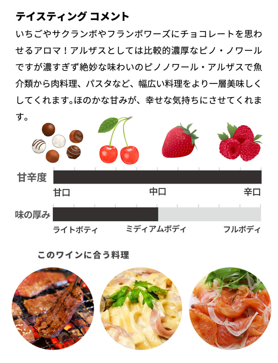 アルザスとしては比較的濃厚なピノ・ノワールですが濃すぎず絶妙な味わいのピノノワール・アルザスで魚介類から肉料理、パスタなど、幅広い料理をより一層美味しくしてくれます。