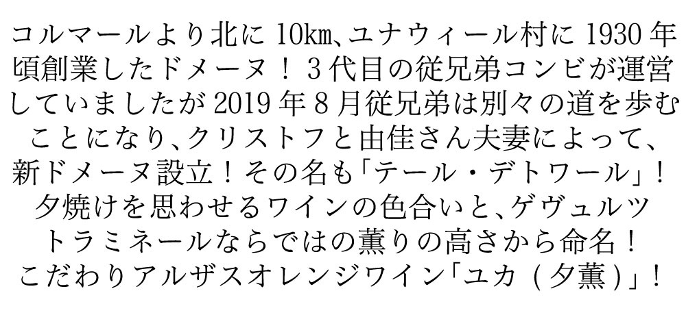 アルザス・ユカ(夕薫)[2021]年 ■ぶどう品種:ゲヴュルツトラミネール100% ■発酵・熟成:ステンレスタンクで果皮とともに15日間マセラシオン、バリックで6ヶ月間シュール・リー熟成 ■樹齢:平均樹齢30年 日本人の由佳さんのドメーヌからユカさんの名を冠した厳選辛口ゲヴュルツトラミネール!コルマールより北に10km、ユナウィール村に1930年頃創業したドメーヌで、1995年に3代目となるマルクとクリストフの従兄弟コンビが継承! 早1998年にはビオロジック栽培を開始し、翌1999年よりビオディナミに転換、2013年に「demeter」の認証を取得!2002年、赤坂のフランス料理店でスー・シェフを務めていた由佳さんがクリストフと結婚!以降、マダムとしてドメーヌを切り盛りしながら、アルザスと日本の懸け橋として活躍しています! 作品名の「夕薫(ゆか)」は、夕焼けを思わせるワインの色合いと、ゲヴュルツトラミネールならではの薫りの高さから命名されました。(旦那さんのクリストフが由佳さんの名前をつけたがったというのもあるそうす!)!「Crepuscule」は「夕焼け」の意味です!