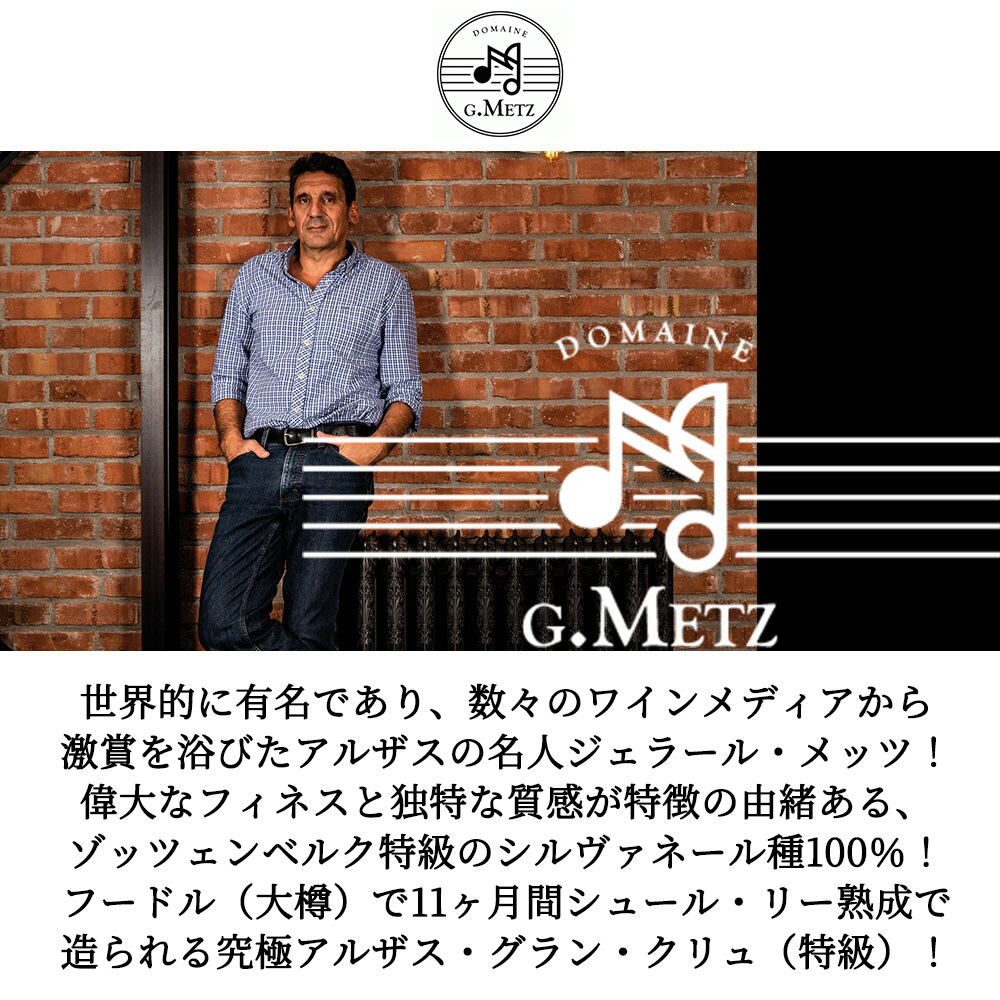 偉大なフィネスと独特な質感が特徴です。しかも長期の熟成能力を誇るワインです。入手困難ドメーヌ・ジェラール・メッツより、究極アルザス・グラン・クリュ・特級・ゾッツェンベルグ・シルヴァネール!