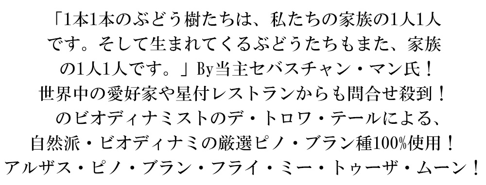 フランス・アルザス・自然派・ビオディナミ(「Biodyvin」の認証&ユーロリーフ認証)辛口白ワイン愛好家大注目!世界中の愛好家や星付レストランからも問い合わせ殺到!のビオディナミストのピノ・ブラン種100%辛口白ワイン!ワイナート誌108号の「アルザス・第3世代も時代がやってきた!」で特集(特集記事)されて以降、自然派ワイン愛好家から問い合わせ殺到!他にも「Bettane & Desseauve」、「Les Meilleurs Vins de France」、「La Revue du Vin de France」、「Guide Hachette」、「Gault & Millau」、「Terre de Vins」、「Cuisine et Vins de France」、「Le Point」、「Le Figaro」、「En Magnum」、「Challenges「JamesSuckling.com」、「Wine Enchusiast」等多数のワインプレスも大注目!また仏ミシュラン3つ星「ラルページュ」「ル・クロ・デ・サンス」、同2つ星「メゾン・ロスタン」「ラ・フルシェット・デ・デュック」等多数のレストランでもオンリスト!造り手のデ・トロワ・テールのセバスチャン・マン家はエギスハイムのドメーヌ・マンの2代目!以下インポーターさんの生産者コメント!『コルマール市から南に7km、エギスハイム村に20世紀初頭より続くぶどう栽培家で、プェルシックベルグとアイシュベルグの2つのグラン・クリュを擁します。長らく協同組合にぶどうを販売してきましたが、1999年に3代目ジャン・ルイ・マンがドメーヌを設立。2004年よりビオロジック栽培を開始し、早2008年には「ECOCERT」の認証を取得しました。2009年、ドメーヌ・バルメ・ブシェール(アルザス)、ドメーヌ・ヴェット・エ・ソルベ(シャンパーニュ)、ドメーヌ・ピエール・ガイヤール(ローヌ)等の自然派ドメーヌでの修行を終えた息子のセバスチャンが帰還して継承。修行先で会得したビオディナミへの転換を進め、2018年には難関の「Biodyvin」(ドメーヌ・ルロワも参加)に加盟しました。「1本1本のぶどう樹たちは、私たちの家族のひとりひとりです。そして生まれてくるぶどうたちもまた、家族のひとりひとりです。私たちは、愛情に溢れたワインを造り、世界中の人々と愛情を共有したいと考えています」(セバスチャン・マン)。セバスチャンの継承によってワインの品質はひとつ上の次元に到達し、フランスのワインガイドの金字塔「ル・ギド・デ・メイユー・ヴァン・ド・フランス(フランスの最優秀ワインのガイド)」は、このドメーヌをアルザスのトップ生産者の一画に挙げるようになりました。(2023年版ではWスター★★評価で掲載作品のすべてが91点以上の快挙!)彼らの作品は、フランス・ミシュラン3つ星の「ラルページュ」や「ル・クロ・デ・サンス」をはじめとする多数の高級レストランにオンリストされています。そのため、「愛情が込められた最高のお料理とのマリアージュのために、最高の飲み頃を迎えたワインを販売したい」という哲学のもと、収穫年順ではなく「飲み頃を迎えたヴィンテージ順」にワインをリリースしています。創造性豊かなラベルの絵は、セバスチャンの友人であるスペイン人シェフ、アルベルト・リエラが描いてくれたものです。』このアルザス・ピノ・ブラン・“フライ・ミー・トゥーザ・ムーン”[2019]年はピノ・ブラン100%!粘土石灰質土壌!樹齢30年以上!収量は50hl/ha!ステンレスタンクでシュール・リー醸造!ラベルの絵はセバスチャンが幼少期より大好きな「星の王子さま」の挿絵をモチーフにしたもので、作品名は、このピノ・ブランが世界中の料理と合わせることができる万能型の白ワインであることを有名な歌の名前にかけて表現したものです!しかもアルザスのグレイトヴィンテージ2019年で、もちろん現地のセラー数ヶ月前の蔵出し品で限定少量入荷!