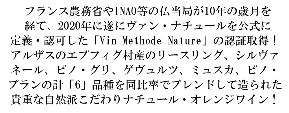 アルザス・辛口・オレンジワイン(6品種のブレンド)愛好家大注目!オレンジワインファン大注目!アルザスのエプフィグ村産の自然派ビオ(エコセール&AB&ユーロリーフ認証)の