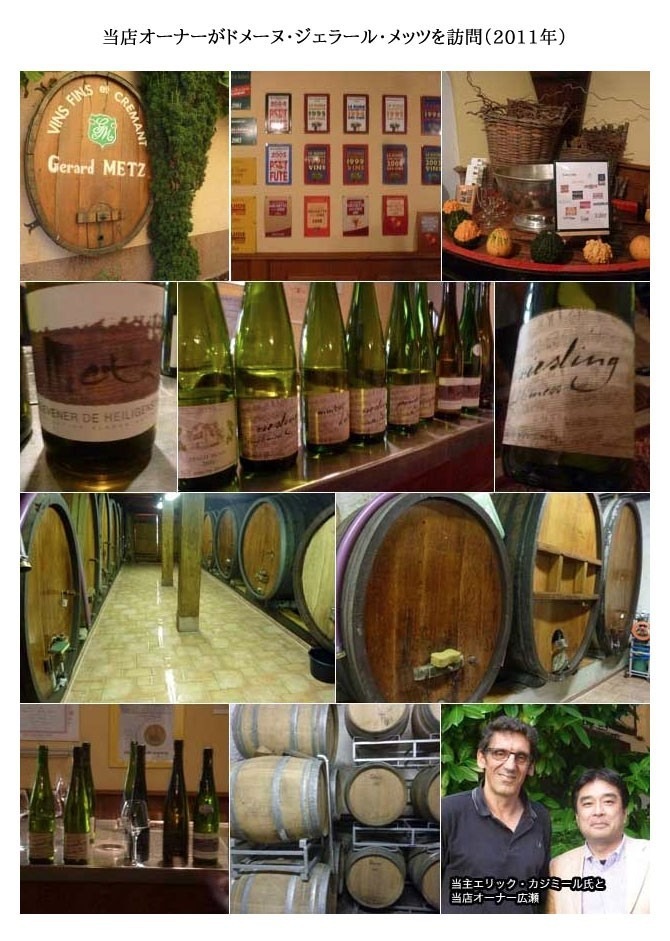 ワインはその嗜好性や芸術性、多様性等において、しばしば音楽に例えられますが、「ジェラール・メッツ」の当主エリック・カジミールは、両者の関連性を独自に高めた哲学に基づくワイン造りを行っています。シャンパーニュ・オーブ地方にRM「ミッシェル・コロン」を運営するコロン家出身の彼が、ランスで看護婦をしていた奥さんと結ばれ、奥さんの実家であるこのアルザスのドメーヌに来たのは1989年。ストラスブールとコルマールのちょうど中間辺り、イッテルスヴィレ村の地において義父となったのは、数多のワインメディアから激賞を浴びた名人ジェラール・メッツでした。偉大な義父より栽培と醸造の極意を叩き込まれながら、シャンパーニュ地方の栽培管理を応用した厳格な収量制限を取り入れるなど独自の改革も行い、1996年、晴れて正式にドメーヌを継承しました。幼少時よりフルートとギターを習い始めたエリックは、音楽に熱中した多感な青年時代を過ごしました。「ロック、ポップス、モッズ、パンク、ヘヴィメタ、ジャズ、クラシックまで、のめり込みました。母は一時期の私の髪型を見て卒倒しそうになりました(笑)」。「ワイン造りに携わるようになってすぐに、これは音楽とまったく同じだと気づきました。ピアノ曲などの演奏で考えると分かりやすいですが、楽曲は、テロワール。アルザスのような土壌の複雑さや古樹は、和音の数が増えるといったような音楽性の高まり。演奏者は、醸造家。楽曲を尊重しながらも自らのイマジネーションをもって解釈し、修練を積んで演奏する。楽曲の素晴らしさと演奏者の心技が一体となった時、言葉では表現できない何かが、五感に響いてきます」。また彼は、醸造所に本格的なオーディオシステムを装備しており、高音質の音楽を聴きながら仕事をすることにこだわっています。「醸造家の精神状態は、仕事の質に直結します。音楽は、私の心を常に穏やかに保ち、幸せな気持ちで仕事をさせてくれます。その心のありようは、きっとワインにも伝わっていると思います。「ピアノソナタ第11番イ長調(第3楽章が「トルコ行進曲」)」をはじめとして、モーツァルトが特に好きです」。「思えば義父ジェラール・メッツの教えも、五感で感じなさい、というものでした。気候の変化を肌で感じる、畑や樹々の個性を全身で感じる、発酵の様態を体で感じる。大事なことはすべて、言葉では説明できません」。ラベルの楽譜は、このドメーヌ初のグランクリュ、「Riesling Grand Cru Muenchberg 1991」の完成を祝して、オペラの演奏で名高い「ストラスブール管弦楽団」に所属していた友人が作曲してくれたワルツからのもので、2009年ヴィンテージより、すべてのワインのラベルに採用されています。「心地よい和音のようなハーモニー(調和)とふくよかさが感じられ、飲むと自分の好きな音楽が自然に聞こえてくるようなワインを造りたいと思っています」。