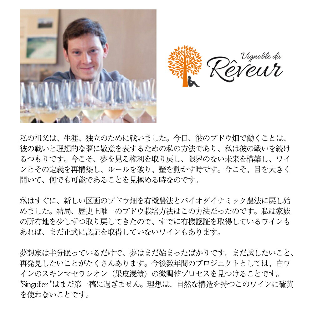 残糖ゼロの辛口であり、その味わいは洗練されており、深みがある。ヴィニョブル・デュ・レヴールの0.3haの小さな畑から生まれたこのワインは、フランス・アルザス地方の伝統と革新が融合した逸品である。