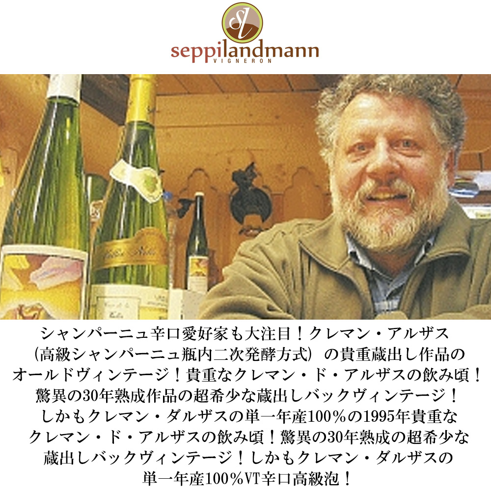 このワインは、アルザス南部ズルツマット村の老舗ドメーヌ、セピ・ランドマンが造る貴重な1995年ヴィンテージのクレマン・ダルザスだ。ピノ・ブランとピノ・オーセロワを同比率でブレンドし、シャンパーニュと同じ瓶内二次発酵方式で造られている。