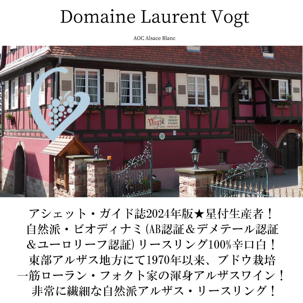 生産者のドメーヌ・ローラン・ヴォグトからのコメントは「自然を愛する者の一員として、作物を第一とし、耳を傾け、調和を大事にしています。全てはブドウをより深く理解して、豊かな環境の中で健やかな成長ができるように守り、最高のワインを皆様にお届けしています。」
