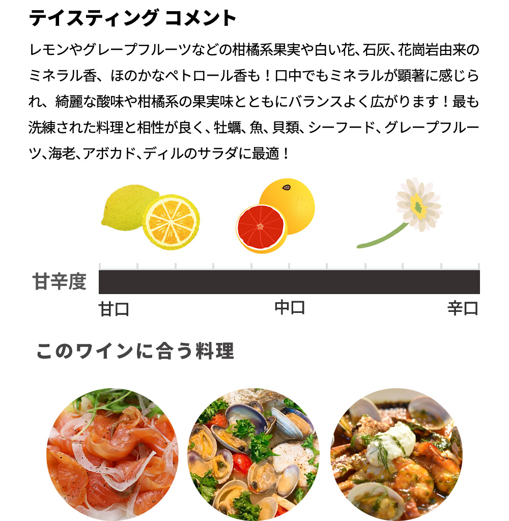 骨格があり、フルボディのミネラルワイン!このワインはレモンやグレープフルーツなどの柑橘系果実や白い花、石灰、花崗岩由来のミネラル香、ほのかなペトロール香も!口中でもミネラルが顕著に感じられ、綺麗な酸味や柑橘系の果実味とともにバランスよく広がります!最も洗練された料理と相性が良く、牡蠣、魚、貝類、シーフード、グレープフルーツ、海老、アボカド、ディルのサラダに最適!