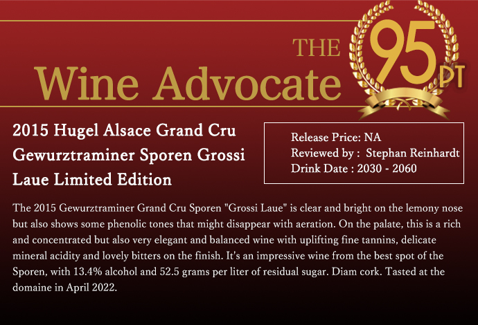 ワインアドヴォケイト誌は『レモンのようなノーズはクリアで鮮やかだが、エアレーションで消えるかもしれないフェノールの色調も示す。口に含むと、リッチで凝縮感があるが、非常にエレガントでバランスの取れたワインで、高揚感のある繊細なタンニン、繊細なミネラルの酸味、フィニッシュには美しいビター感がある。アルコール度数13.4%、残糖52.5グラム/リットルという、スポーレンのベストスポットから生まれた印象的なワインだ。』と大絶賛!