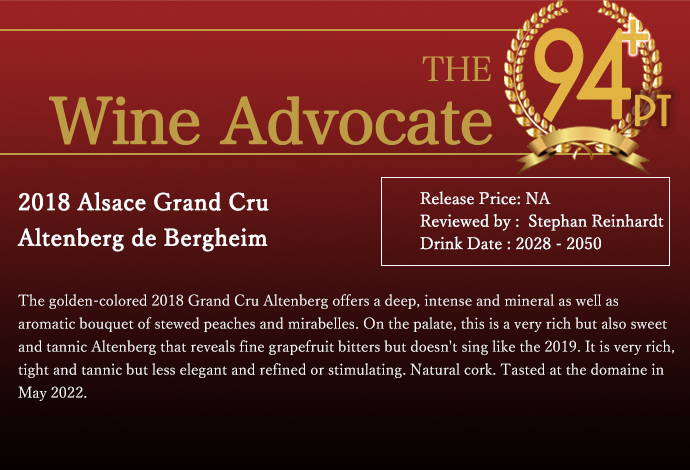 ワインアドヴォケイト誌は「2018年のグランクリュ・アルテンベルクは、煮た桃とミラベルの深く、強烈で鉱物的かつ香り高いブーケを提供します。口に含むと、非常にリッチでありながら甘く、タンニンのあるアルテンベルクで、繊細なグレープフルーツの苦味を明らかにしますが、2019年のようにさえずりません。非常にリッチで、引き締まっており、タンニンが強いですが、優雅さや洗練さ、刺激は少ないようです。」と大絶賛!