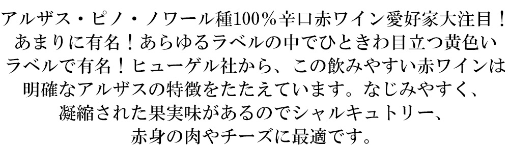 有名なブルゴーニュ品種から造られていながらアルザスの特徴を明確に表すワインです。ヒューゲルのピノ・ノワールは強い果実味がしなやかで、シャルキュトリーや赤身の肉やチーズとの相性は完璧です。