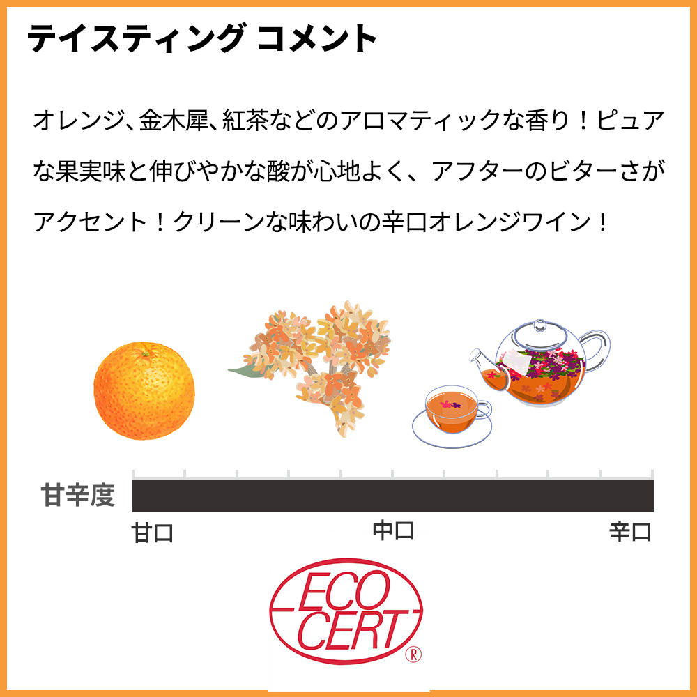 オレンジ、金木犀、紅茶などのアロマティックな香り!ピュアな果実味と伸びやかな酸が心地よく、アフターのビターさがアクセント!クリーンな味わいの辛口オレンジワインが限定少量入荷!