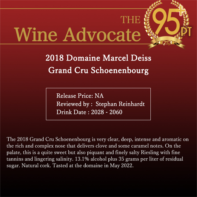 ロバート・パーカー ワインアドヴォケイト誌でこの[2018]年で驚異の95+点でコメントは「2018年グラン・クリュ・シュネンブルグは、非常に透明感があり、深みと濃密さ、そして豊かな香りを放つ複雑な香りで、クローブとキャラメルのニュアンスを感じさせる。口に含むと、かなり甘みがあるが、同時にピリッとした辛味と繊細な塩味を伴うリースリングで、上質なタンニンと余韻に残る塩味が特徴。アルコール度数13.1%、残糖量35g/L。天然コルク。」!