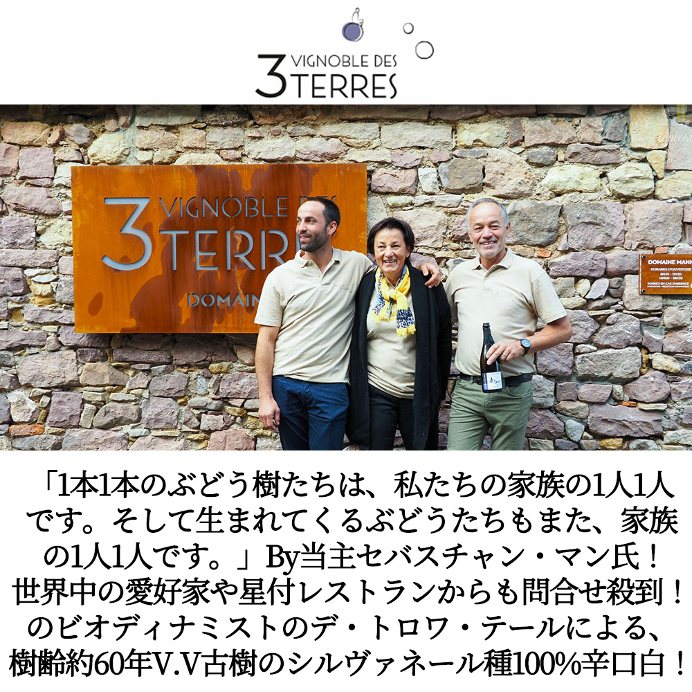 造り手のデ・トロワ・テールのセバスチャン・マン家はエギスハイムのドメーヌ・マンの2代目!以下インポーターさんの生産者コメント!『コルマール市から南に7km、エギスハイム村に20世紀初頭より続くぶどう栽培家で、プェルシックベルグとアイシュベルグの2つのグラン・クリュを擁します。長らく協同組合にぶどうを販売してきましたが、1999年に3代目ジャン・ルイ・マンがドメーヌを設立。2004年よりビオロジック栽培を開始し、早2008年には「ECOCERT」の認証を取得しました。2009年、ドメーヌ・バルメ・ブシェール(アルザス)、ドメーヌ・ヴェット・エ・ソルベ(シャンパーニュ)、ドメーヌ・ピエール・ガイヤール(ローヌ)等の自然派ドメーヌでの修行を終えた息子のセバスチャンが帰還して継承。修行先で会得したビオディナミへの転換を進め、2018年には難関の「Biodyvin」(ドメーヌ・ルロワも参加)に加盟しました。「1本1本のぶどう樹たちは、私たちの家族のひとりひとりです。そして生まれてくるぶどうたちもまた、家族のひとりひとりです。私たちは、愛情に溢れたワインを造り、世界中の人々と愛情を共有したいと考えています」(セバスチャン・マン)。