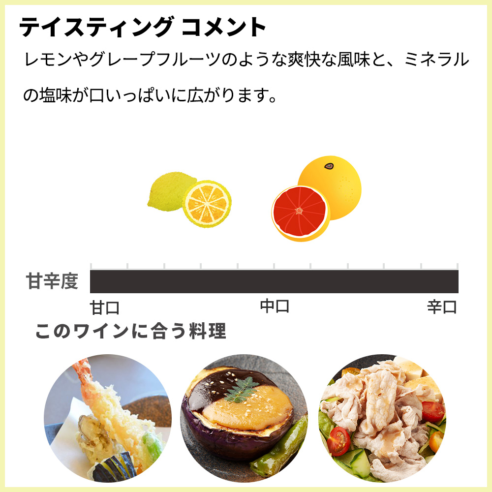 レモンやグレープフルーツのような爽快な風味と、ミネラルの塩味が口いっぱいに広がります。
