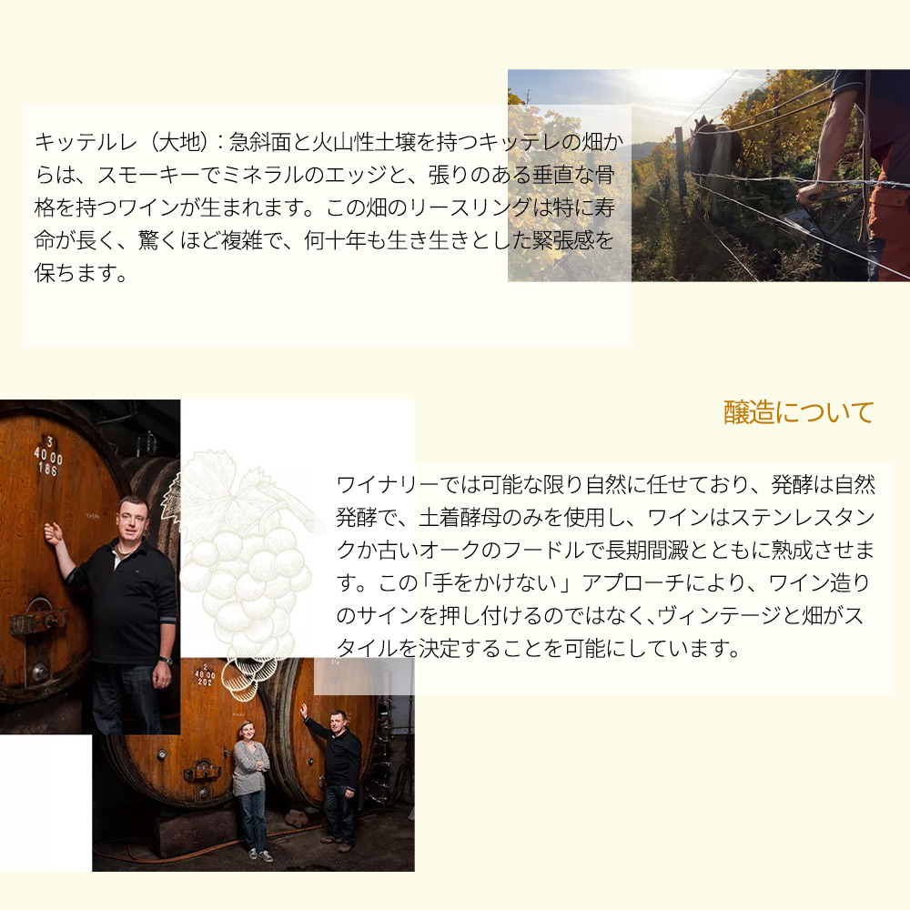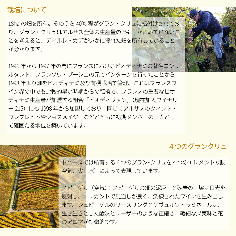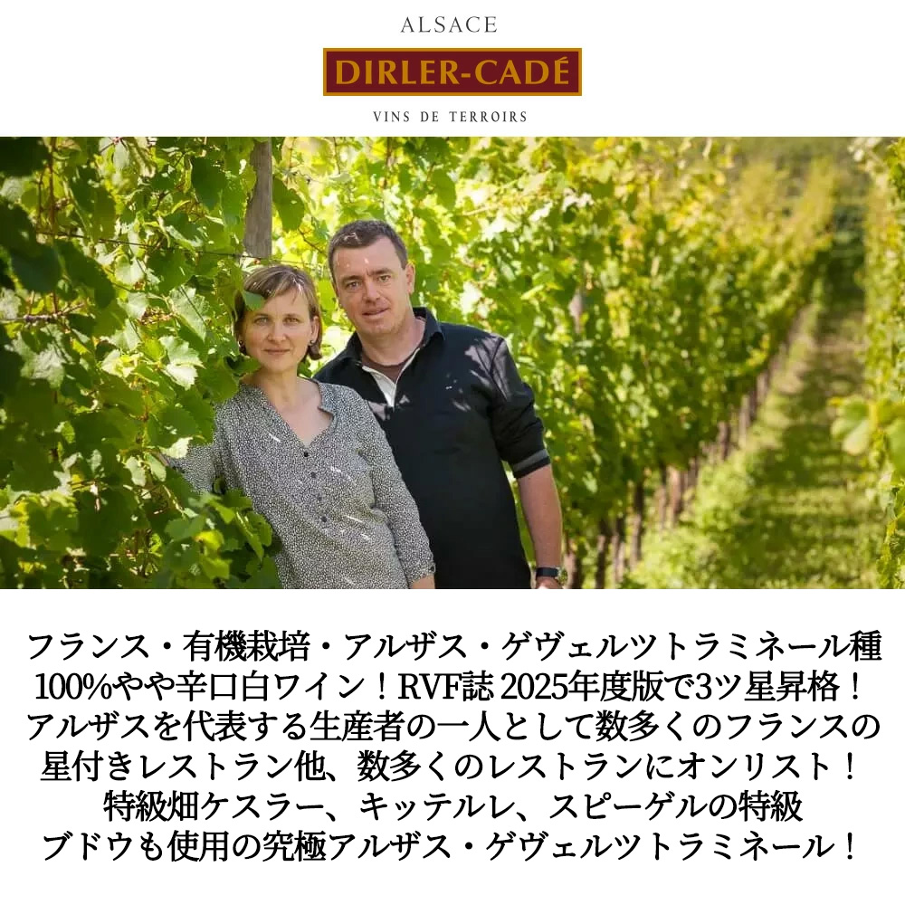造り手のドメーヌ・ディルレ・カデは『アルザスでも初期からビオディナミ栽培を取り入れたRVF誌3ツ星生産者でディルレ家とカデ家の結婚により2000年に設立されたドメーヌ・ディルレ・カデ。前身のジャン・ディルレ時代の1998年よりビオディナミ栽培を取り入れており、今日ではRevue du Vin deFrance 2025年度版にて3ツ星に昇格 (もちろん2026年版でも3ツ星獲得) の快挙。アルザスを代表する生産者の一人として数多くのフランスの星付きレストラン他、数多くのレストランにオンリストされています。』