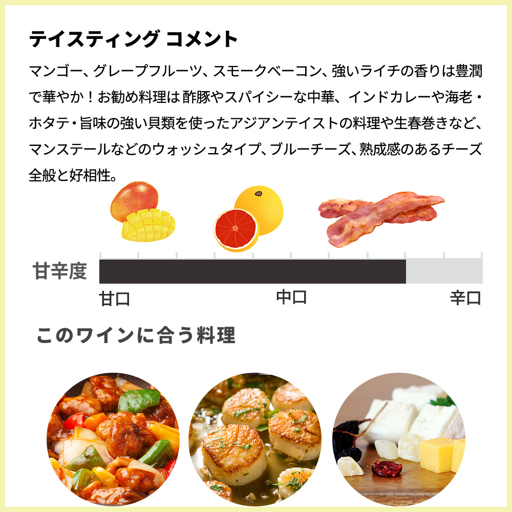 【テイスティングノート】はマンゴー、グレープフルーツ、スモークベーコン、強いライチの香りは豊潤で華やか!豊かで官能的なゲヴェルツトラミネール。