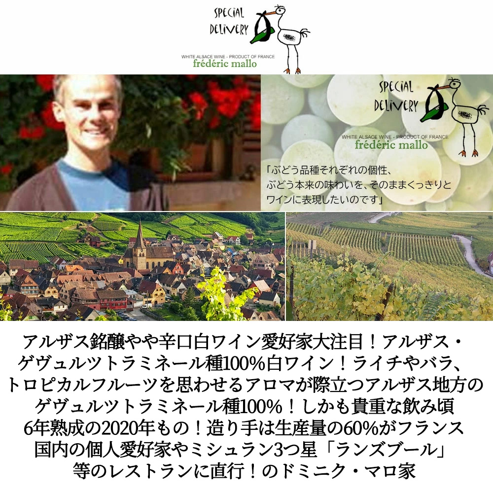 アルザスのシンボルでもあるコウノトリは赤ちゃんを運んでくれますが、せっかくならアルザスの美味しいワインも運んでほしいという思いでこのブランド“スペシャル・デリバリー”をリリース!造られるワインも超こだわりの本格派!「ぶどう品種それぞれの個性、ぶどう本来の味わいをそのままくっきりとワインに表現したい」とドミニク・マロ氏が断言するように、アルザスの代表的ぶどう品種の個性が分かりすぎるほどよく分かるワインに仕上がっている!