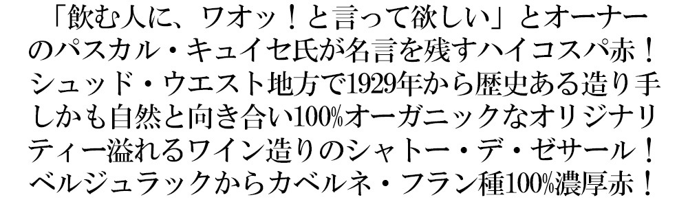 ベルジュラックは今、最もワイルドでエキサイティング!!ワインライターのアンドリュー ジェフォードはベルジュラックについて、「フランスのワイン産地の中で、最もワイルドで、何が起こるか分からないエキサイティングなエリアだ」と述べ、注目しています。ベルジュラックの生産者はそのエリアの持つ多様性を尊重しながら、パイオニア的な方法をと取り入れて、優れたワイン造りをしています。ゼサールのパスカル キュイセは記事の中で、「ワインにはテロワールのワインか、テクニックのワインしかないという意見には反対だ。それはみせかけの議論にすぎない。ワインとは喜びだ。ニューワールド対オールドワールドではなく、問題は良いワインかどうかということだけだ。しかし、そうは言ったけれど、自分はベルジュラックがフランスにおけるニューワールドであると認識されて欲しいと思っている。自分はニューワールドで使われている様々なテクニックを取り入れている。白にはドライアイスの使用、夜間の収穫、そして長めのスキンコンタクトを行う。 ~中略~ 最近、ワインがとても複雑でわかりにくいものになってしまっている。でも本来ワインは“ワイン、音楽、そして祭りだ!”というものであってほしいと自分は思うよ。」と言っています。
