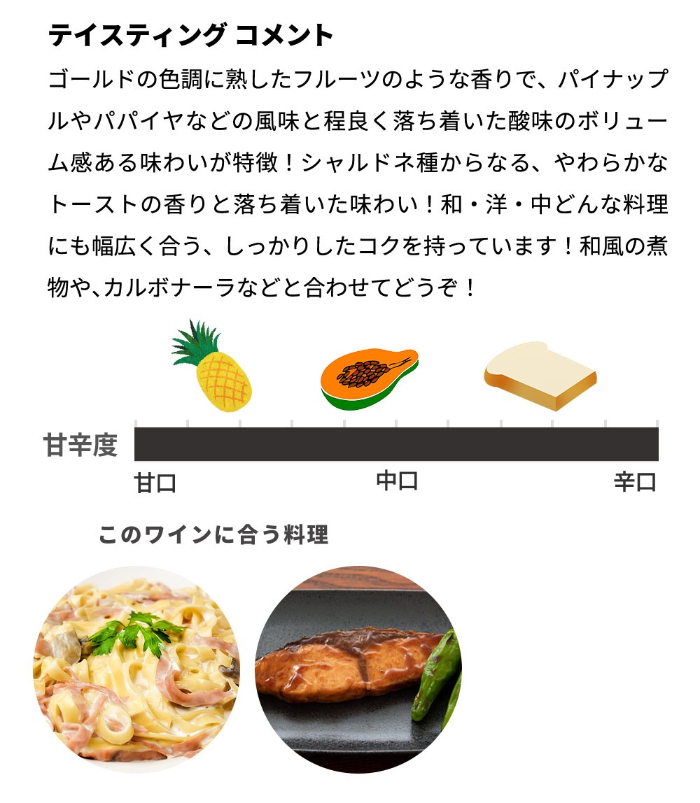 粘土石灰質土壌の温暖な気候で育ったシャルドネをステンレスタンクで発酵・熟成で造られたこのワインは、ゴールドの色調に熟したフルーツのような香りで、パイナップルやパパイヤなどの風味と程良く落ち着いた酸味のボリューム感ある味わいが特徴!シャルドネ種からなる、やわらかなトーストの香りと落ち着いた味わい!和・洋・中どんな料理にも幅広く合う、しっかりしたコクを持っています!和風の煮物や、カルボナーラなどと合わせてどうぞ!