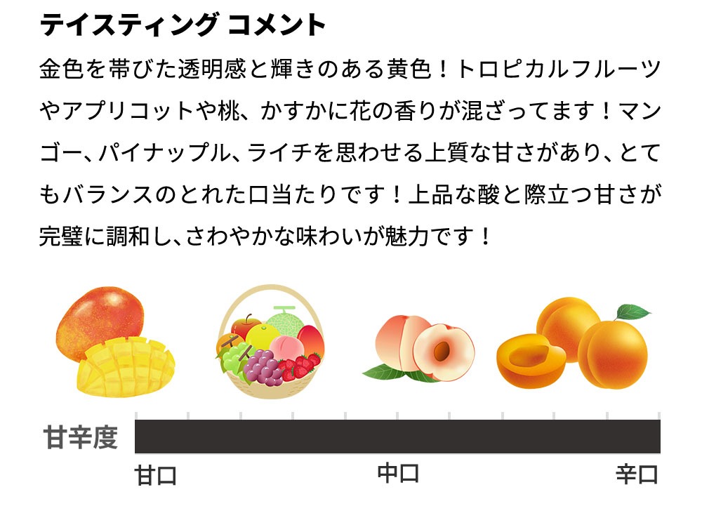 パシュラン・デュ・ヴィック・ビル・ドゥー“19.58”[2021]年・ドメーヌ・ラウゲ元詰・プティ・マンサン種100%・新樽100%熟成・AOCパシュラン・デュ・ヴィック・ビル・ドゥー ■ぶどう品種:プティ・マンサン種100% ■発酵・熟成:アルコール発酵は低温でコントロールしながらタンクで行います!熟成は新樽で8ヶ月 ■土壌:土壌は粘土質シルトと砂利の混ざる土壌 ■栽植密度:4,400本/ha 造り手のダバディ家のこだわりが詰まった(若き当主29歳のシルヴァンが手掛ける個性的な辛口白ワイン)パシュラン・デュ・ヴィック・ビル! “19.91”は、造り手渾身!オーナーの父の生まれ年の年号が(ワインの名前となっている「19.58」はドメーヌ・ラウゲの3代目でシルヴァンの父、ピエールの生まれた年であることに由来しています。)付けられた甘口白ワイン愛好家垂涎の一本! 金色を帯びた透明感と輝きのある黄色!トロピカルフルーツやアプリコットや桃、かすかに花の香りが混ざってます! マンゴー、パイナップル、ライチを思わせる上質な甘さがあり、とてもバランスのとれた口当たりです!上品な酸と際立つ甘さが完璧に調和し、さわやかな味わいが魅力です!