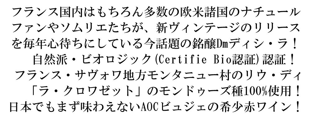 フランス・サヴォワ辛口赤ワイン愛好家大注目!フランス・ヴァン・ド・サヴォワ地方からモンドゥーズ・ノワール種100%の辛口赤ワイン!フランス・サヴォワ地方・アン県のビュジー渓谷で造られるAOCビュジェ辛口赤ワイン愛好家大注目!しかも自然派・ビオロジック(Certifie Bio認証)のモンドゥーズ種100%辛口赤ワイン!しかもモンタニュー村のリウ・ディ「ラ・クロワゼット」のモンドゥーズ種100%!造り手は「Glou Guide」、「Rando-vin en France」、「La Revue des Vins de France」、「180 ℃ special vins」、「Le Monde」、「Regain」等、ワイン誌も大注目!『「ビュジェ」南部、クリュ「モンタニュー」中心部に位置するグロスレ・サン・ブノワ村にて、長年ビオロジック栽培を実践しながら素晴らしいワインを造っていたパトリック・シャルランは、引退に際し、彼の意志を継いでくれる若者に畑を譲りたいと考えていました。そして2017年、各所で修行を重ねた後自身の自然派ワイン造りを志向していたアドリアン・バリオルとフロリー・ブリュネのカップルとの幸福な邂逅が訪れ、ここに、6ヘクタールもの宝石のような畑を擁する自然派ドメーヌ「ディシ・ラ(現在から未来まで)」が誕生しました。「パトリックも私たちも、ぶどう栽培やワイン造りといったこと以前に、すべてのおおもとは「生物多様性」にあると考えていましたので、すぐに意気投合することができました。私たちは、この地の大自然の結晶のようなぶどうの美味しさをそのままワインにするためヴァン・ナチュールへと進化させることを提案し、パトリックも大いに喜んでくれました」。急勾配をものともせずに毎日畑仕事に精魂傾ける二人の献身、情熱、そしてセンスによって、彼らの作品は5年と待たずにビュジェを代表するヴァン・ナチュールと言われるようになりました。フランス国内はもちろん多数の欧米諸国のナチュールファンやソムリエたちが、新ヴィンテージのリリースを毎年心待ちにしています。※こちらの生産者の作品は極めて少量でのご案内になります。』アンフォール[2021]年・蔵出し品・ドメーヌ・ディシ・ラ元詰・自然派・ビオロジック(Certifie Bio認証)はフランス国内70%(レストラン、ワインショップ、個人のヴァン・ナチュール愛好家)に直行!モンドゥーズ種100%!モンタニュー村のリウ・ディ「ラ・クロワゼット」にわずか0.5ha!粘土石灰質土壌!平均樹齢40年のVV!収量40hl/ha!除梗50%!粘土製のアンフォラで発酵後、10ヶ月間熟成!無清澄、ノンフィルターでビン詰め!ビン詰め時にのみ極少量のSO2を使用!SO2は作品によって不使用~ビン詰め時にのみ極少量使用!もちろん、現地のセラー数ヶ月前の蔵出し品で限定少量入荷!