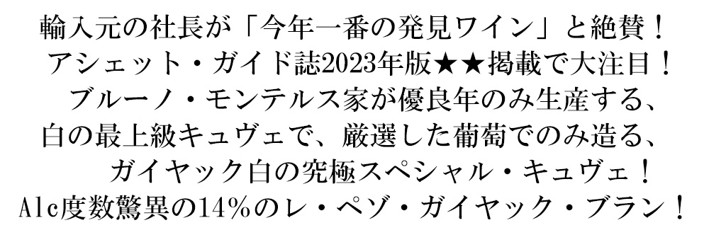 フランス南西地方(シュッド・ウエスト)から高級AOCガイヤックの辛口白ワイン(アルコール度数驚異の14%)!しかも最優良なヴィンテージにのみ生産!素晴らしいぶどうが造られた年のみ生産される白の最上級キュヴェで、厳選した葡萄でのみ造る、輸入元の稲葉の社長に今年一番の発見と言わしめたガイヤック白のスペシャル・キュヴェ!