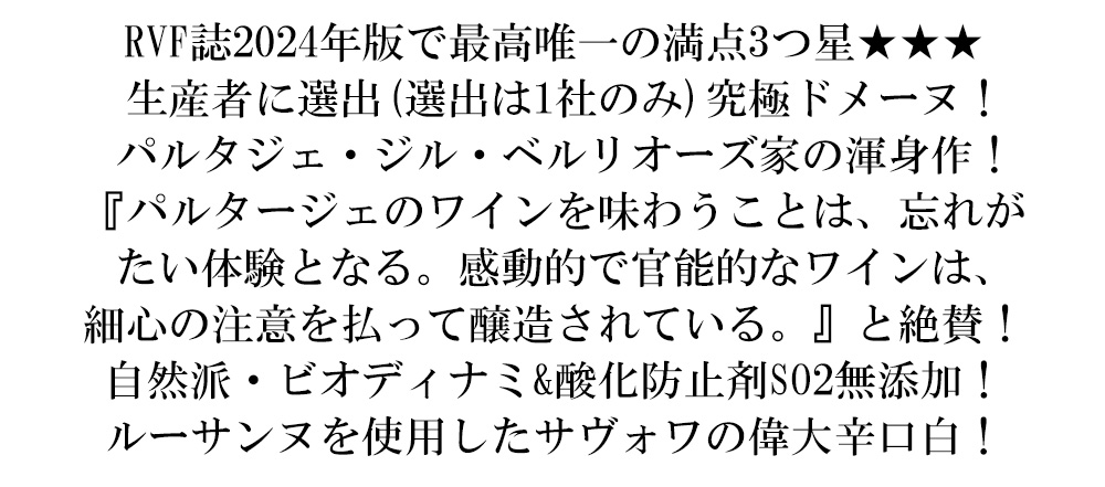 ある評論家曰く『ドメーヌ・パルタージェのワインを味わうことは、忘れがたい体験となる。感動的で官能的なワインは、細心の注意を払って醸造されている。最高のビオディナミ栽培だ。』と絶賛!
