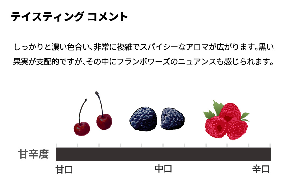 しっかりと濃い色合い、非常に複雑でスパイシーなアロマが広がります。黒い果実が支配的ですが、その中にフランボワーズのニュアンスも感じられます。