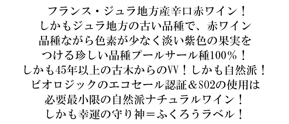 希少!フランス・ジュラ地方産辛口赤ワイン愛好家大注目!しかもジュラ地方の古い品種(ジュラ原産の赤ワイン用のブドウ品種で15世紀から栽培されている。粒は小さめで、味わいは軽め、エレガントなタイプのワインが造られる事が多い。)で、赤ワイン品種ながら色素が少なく淡い紫色の果実をつける珍しい品種プールサール種100%!しかも45年以上の古木からのヴィエイユ・ヴィーニュ!しかも自然派!早2009年よりビオロジック栽培を実践し続けており、2018年に「ECOCERT」の認証を取得のSO2の使用は必要最小限の自然派ナチュラルワイン!ワイン評価誌の評価も高く「Guide Hachette」、「La Revue du Vin de France」等 掲載多数!しかも造り手についてインポーターの上田社長は『ジュラ中央部のル・ヴェルノワ村に1919年から続くヴィニュロンの家系で、1945年にドメーヌを設立して自社ビン詰めを開始しました。1976年に継承した3代目ピエールによって大いに発展を遂げ、2017年に、ブルゴーニュ、サン・テミリオン、プロヴァンスでの修行を終えた4代目ヴァンサンが継承しました。早2009年よりビオロジック栽培を実践し続けており、2018年に「ECOCERT」の認証を取得しています。「ヴィニュロンという職業の本質は、素晴らしい品質のぶどうを作ることです。そのために最も大切なことは、ぶどう畑を取り巻く界および土の中に生物多様性を実現し、土壌を活性化することです。私たちはぶどう畑の周囲に多種多様な草花を植え、自家製のハーブの煎じ薬を撒いて世話をしています。また生け垣と池を作って、様々な虫や小動物が安心して暮らせる環境を整えています。夏には一部の畑作業を夜間に行いますが、これは暑さを避けるためだけでなく、蜂による日中の花粉媒介のじゃまをしないようにするためでもあります。すべての施策は結果的に土壌を活性化させることにつながり、この地のテロワールがくっきりと反映された素晴らしいぶどうの育成につながります。テロワールの明瞭化を子の代、孫の代まで永続させるために、マス選抜も実施しています」。「醸造のキーワードは、衛生管理、安全管理、品質管理です。人的・技術的介入は最小限に抑え、高品質のぶどうが高品質のワインに生まれ変わるのを見守ります。設備は最新鋭ですが、醸造法は家族に代々伝わる伝統的な手法を貫徹しています。もともとのぶどうの鮮やかな果実味をそのまま味わっていただきたいので、SO2の使用は必要最小限に抑えています」。彼のワインは総じて、みずみずしい果実味と繊細で上品な口当たりを特徴とします。各要素のバランスが均整で、口の中でふんわりととろけるように感じられます。非常に長い余韻も心に残ります。「両親から自宅を譲り受けた際、屋根裏部屋につがいのフクロウとたくさんのひな鳥たちが住んでいるのを見つけました。フランスではフクロウは幸運の守り神とされており、私たちのシンボルとしてラベルに採用することにしました」。このラ・シュエット プルサール プルプル・ドール[2023]年・蔵出し限定作品・ドメーヌ・ピエール・リシャール元詰(4代目ヴァンサン・リシャール家)(幸運の守り神=ふくろうラベル)はAOC Cotes de Jura。プルサール種100%。マントリー村の1.3haの区画より。粘土石灰質・泥灰土質土壌。平均樹齢35年のVV。収量は40hl/ha。年によってステンレスタンクまたは500リットルの粘土製アンフォラで発酵後、12ヶ月間シュール・リー熟成。SO2の使用は必要最小限。