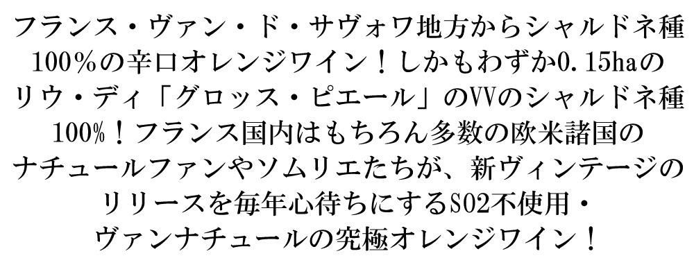 自然派・ビオロジック(Certifie Bio認証)のシャルドネ種100%のSO2不使用・ヴァンナチュールの辛口オレンジワイン!しかもグロスレ・サン・ブノワ村のわずか0.15haのリウ・ディ「グロッス・ピエール」のシャルドネ種100%!造り手は「Glou Guide」、「Rando-vin en France」、「La Revue des Vins de France」、「180 ℃ special vins」、「Le Monde」、「Regain」等、ワイン誌も大注目!