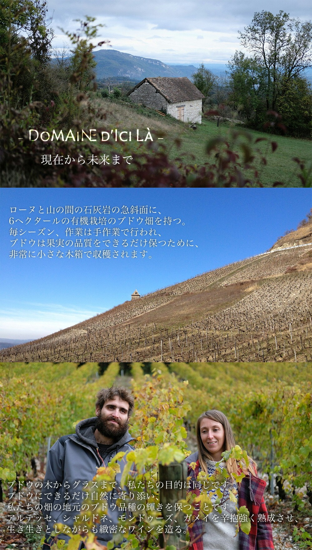 地の大自然の結晶のようなぶどうの美味しさをそのままワインにするためヴァン・ナチュールへと進化させることを提案し、パトリックも大いに喜んでくれました」。急勾配をものともせずに毎日畑仕事に精魂傾ける二人の献身、情熱、そしてセンスによって、彼らの作品は5年と待たずにビュジェを代表するヴァン・ナチュールと言われるようになりました。フランス国内はもちろん多数の欧米諸国のナチュールファンやソムリエたちが、新ヴィンテージのリリースを毎年心待ちにしています。
