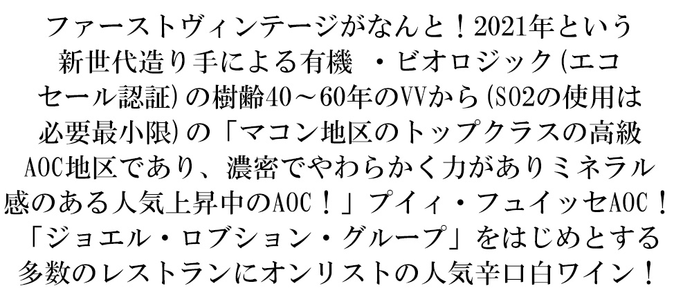 高級プイィ・フュイッセ愛好家垂涎!「マコン地区のトップクラスの高級AOC地区であり、濃密でやわらかく力がありミネラル感のある、現在プルミエ・クリュも増えさらに人気上昇中のAOC!」