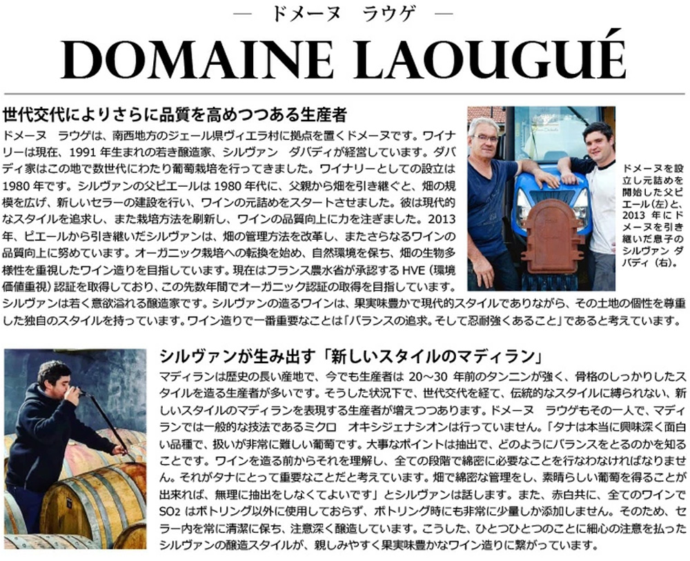 世代交代により人気も品質も急上昇のドメーヌ・ラウゲのこだわりが詰まった、このワインは輝きのある紫色、イチゴやチェリー、スグリ、スミレの花のアロマにかすかにエレガントなスパイスの要素が混ざっています!素晴らしく熟した果実、丸みのあるやわらかな口当たり、タンニンはシルクのようになめらかに溶け込んでいます!かすかにミネラルの要素が余韻を引き締め、独自のスタイルと個性がしっかりと感じられるフルボディ辛口赤ワインが蔵出し品の正規品で限定少量入荷!