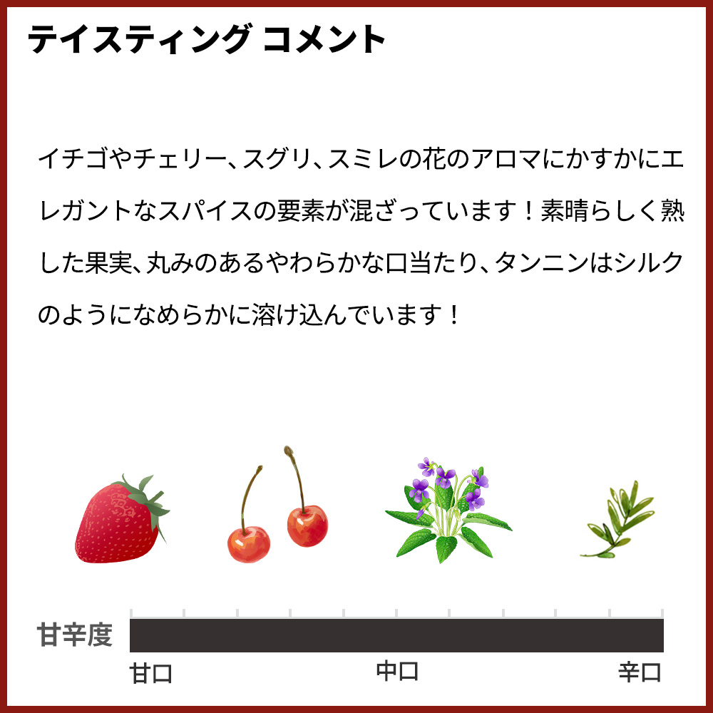 ■発酵・熟成:マロラクティック発酵後、約8ヶ月樽熟成