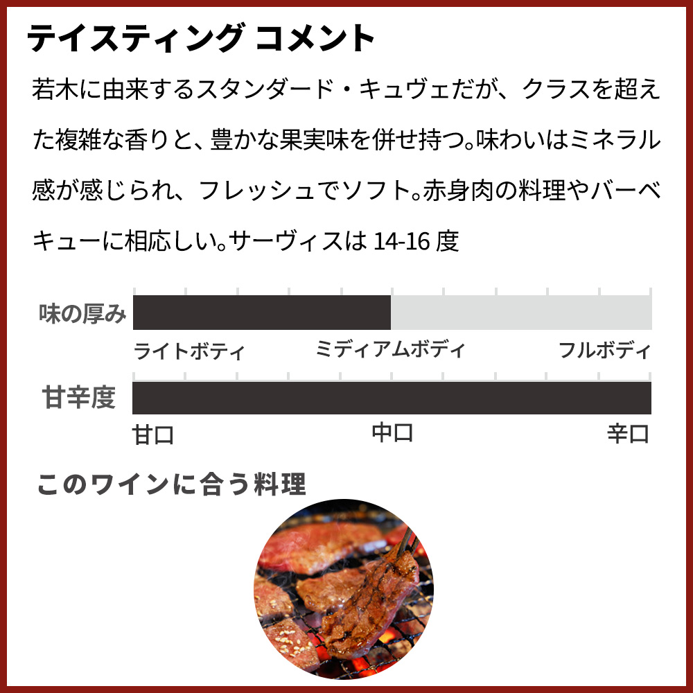 『ギョームの畑には35種類以上あると言われるフランスで栽培されているピノ・ノワールのすべてのクローンが栽培されている。このキュヴェは、フランス現存のすべてのクローンのアッサンブラージュから醸される。なかにはDRCが依頼したマッサル選抜のブドウ樹 (ギョームから出荷後、DRCの畑に植樹) の母樹も存在し、これもアッサンブラージュに使用される。若木に由来するスタンダード・キュヴェだが、クラスを超えた複雑な香りと、豊かな果実味を併せ持つ。味わいはミネラル感が感じられ、フレッシュでソフト。赤身肉の料理やバーベキューに相応しい。サーヴィスは14-16度。』