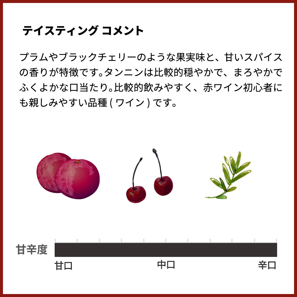 フローラル(プラムやブラックチェリーのような果実味と、甘いスパイスの香りが特徴です。タンニンは比較的穏やかで、まろやかでふくよかな口当たり。比較的飲みやすく、赤ワイン初心者にも親しみやすい品種 (ワイン) です。