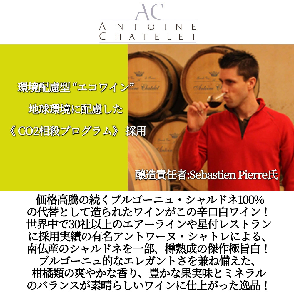 エレガントさを求められるお客様へ!高騰の続くブルゴーニュ・シャルドネ100%の代替として造られたワインがこのブルゴーニュの造り手によるエレガントさを兼ね備えたヴァン・ド・フランス辛口白ワイン!