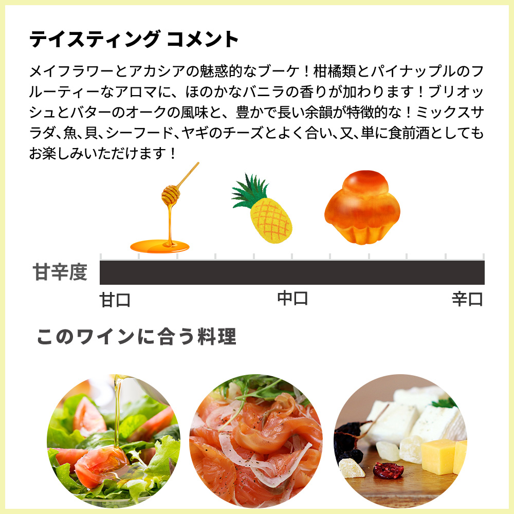 緑色を帯びた輝くゴールド!メイフラワーとアカシアの魅惑的なブーケ!柑橘類とパイナップルのフルーティーなアロマに、ほのかなバニラの香りが加わります!エレガントで滑らか、そしてバランスの取れた典型的なシャルドネ!この複雑なワインは、ブリオッシュとバターのオークの風味と、豊かで長い余韻が特徴的な絶品辛口白ワイン!