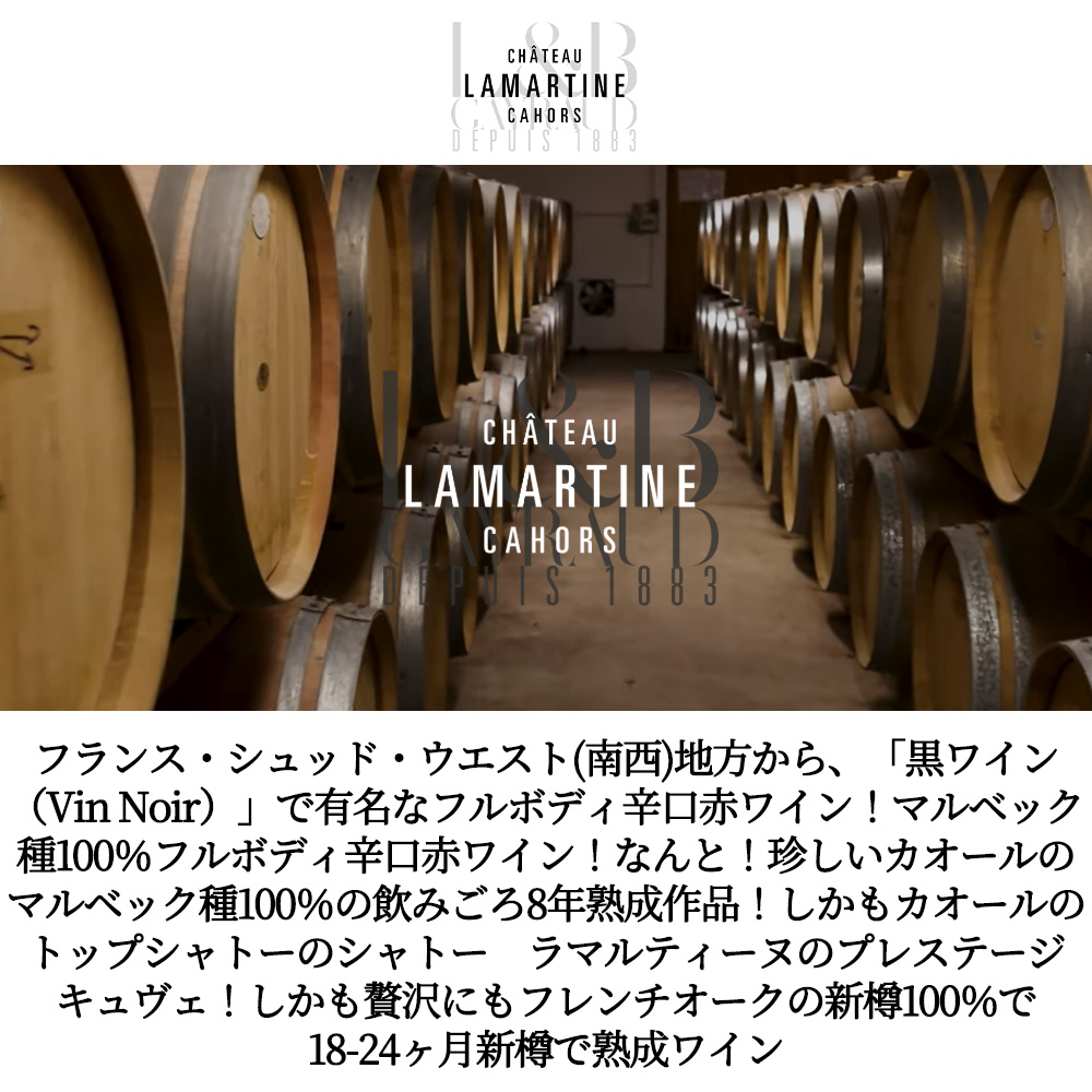 なんと!珍しいカオールのマルベック種100%の飲みごろ8年熟成作品!しかもカオールのトップシャトーのシャトー ラマルティーヌのプレステージキュヴェ!しかも贅沢にもフレンチオークの新樽100%で18-24ヶ月新樽で熟成。