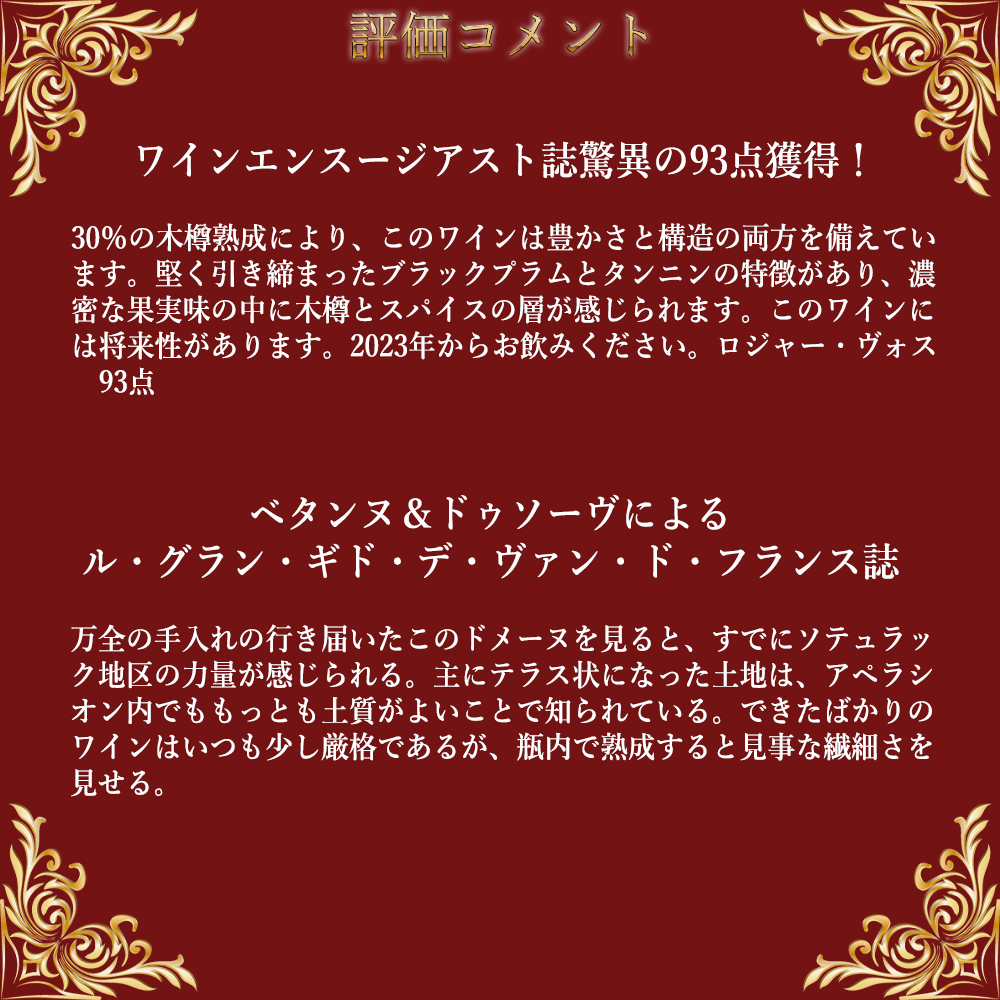 「パワフルで集約感があり、特別な時に飲むワイン」と当主バンジャマンからコメントさせた貴重な飲み頃8年熟成人気フルボディ辛口赤ワインが限定で蔵出し作品で極少量入荷!