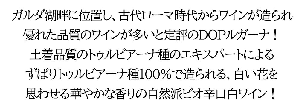 マランゴーナ ルガーナ [2022]年 マランゴーナ ■葡萄品種:トゥルビアーナ種100% ■土壌:粘土石灰質 ■樹齢:20~35年 ■収穫:手摘み ■ 畑情報:ガルダ湖南端に広がる「ポッツォレンゴ」、「シルミオーネ」と「ペスキエーラ」の3つの村の畑のブレンド。粘土石灰質土壌。 ■ 栽培・収穫:樹齢20~35年。仕立てはダブルアーチ型。イタリアオーガニック認証機関Valoritalia srl認証の有機栽培。手摘み収穫。年産10,000本。 ■ 醸造・熟成:全房にて浸漬後、14℃に調整されたステンレスタンクにて発酵。その後、ガラス吹付をしていない特殊なセメントタンクにてシュールリーで3~4ヶ月熟成。 イ 土着品種のトゥルビアーナを使った白い花を思わせる華やかな香り、非常にクリーンでミネラル豊かな白ワイン。