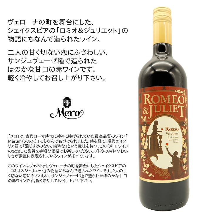 ロミオ&ジュリエット ロッソ 2021年 ◆ROMEO & JULIET ROSSO 2021 IGT Rosso Veronese ◆種類:赤ワイン ◆テイスト:ミディアムボディ ◆生産地:イタリア / ヴェネト / IGTヴェネト ◆生産者:メロ ◆ヴィンテージ:[2021]年 ◆内容量:750ml ヴェネト州、ヴェローナの町を舞台にしたシェイクスピアの「ロミオ&ジュリエット」の物語にちなんで造られたワインです。2人の甘く切ない恋にふさわしい、サンジュヴェーゼ種で造られたほのかな甘口の赤ワインです。軽く冷やしてお召し上がり下さい。