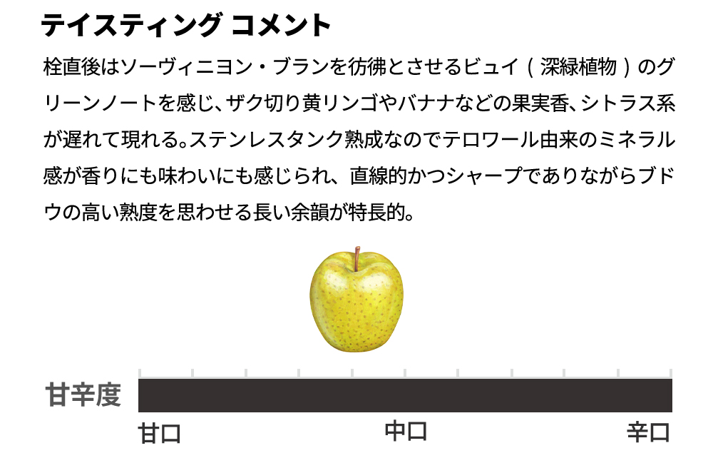 ザク切り黄リンゴやバナナなどの果実香、シトラス系が遅れて現れる。ステンレスタンク熟成なのでテロワール由来のミネラル感が香りにも味わいにも感じられ、直線的かつシャープでありながらブドウの高い熟度を思わせる長い余韻が特長的。