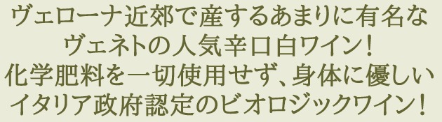 ヴェローナ近郊で産するあまりに有名!なヴェネトの人気辛口白ワイン!しかも化学肥料を一切使用せず、身体に優しいイタリア政府認定のビオロジックワイン(有機ワイン)!造り手はワインを1898年、ピエトロ・サルトーリによって自分のホテルで良質なワインを出すため、畑と小さなセラーを購入したことから始まったワイナリー!100年を経て、現当主で4代目!ヒュー・ジョンソン氏も「ポケットワインブック」の中で、おすすめ生産者の一人に押す、ソアーヴェの人気生産者!