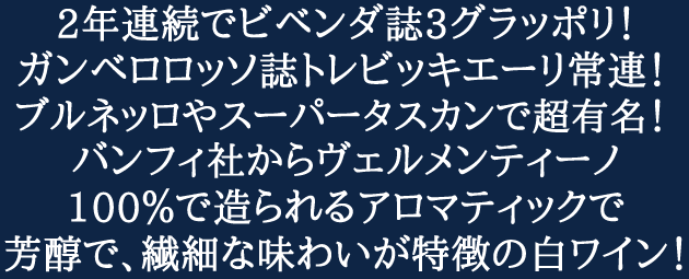 ラ・ペッラゴラ(トスカーナ沿岸に住む鳥、アカアシシギの意で、イタリアではおしゃべり好きな人の意)という名が付けられた大人気辛口白ワイン。アプリコットやグレープフルーツ、花や地中海の低木地域に特有のスパイスの香りを持ったヴェルメンティーノ。