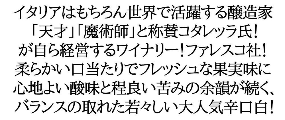 ファレスコ・サン・ロレンツォ・ビアンコ・ウンブリア[2022]年 ■ぶどう品種:トレッビアーノ85%/ロシェット15% 造り手はイタリアを代表するエノロゴ!イタリアはもちろん、世界の60以上のワイナリーで活躍する醸造家!「天才」「魔術師」と称されるリッカルド・コタレッラ氏自ら経営するワイナリー!ファレスコ社!からトレッビアーノ85%とロシェット15%をステンレスタンク+瓶内熟成2ヶ月で リリースされる辛口白ワイン! 輝きのある美しく輝く緑がかった淡いペールイエロー!ミントにライム、レモンを想わせるシトラス系の爽やかな香りに続き、ピーチなどの甘いアロマが徐々に広がる!アタックは活き活きとした酸を感じ、あとからグレープフルーツのような心地良い果実味と程よい苦味が楽しめる!