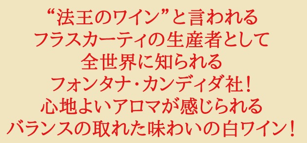 フラスカーティの造り手として名高いフォンタナ・カンディダ社ならではのフレッシュで香り高い味わいの辛口白ワイン!