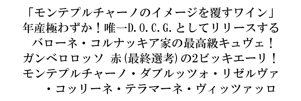イタリア辛口フルボディ赤ワイン愛好家大注目!年産わずか!唯一D.O.C.G.としてリリースするバローネ・コルナッキア家の最高級キュヴェ!