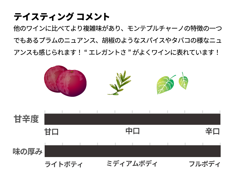 力強さと繊細さを兼ね備えたコッリーネ・テラマーネ!他のワインに比べてより複雑味があり、モンテプルチャーノの特徴の一つでもあるプラムのニュアンス、胡椒のようなスパイスやタバコの様なニュアンスも感じられます!