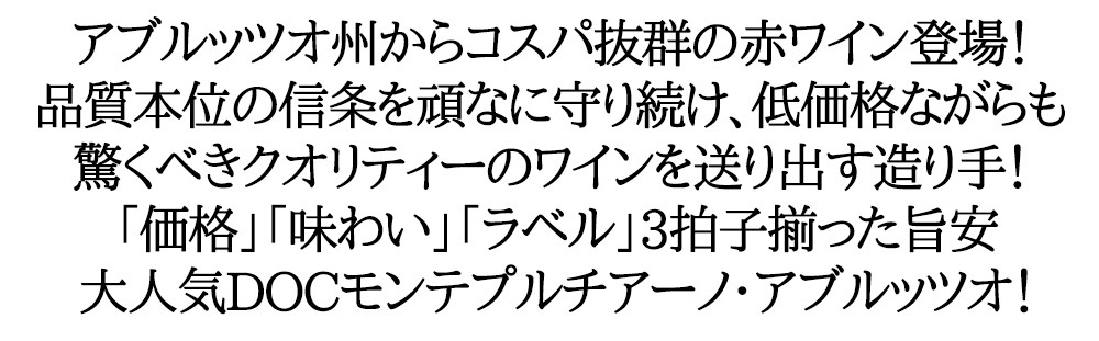 アブルッツオ州からコスパ抜群の赤ワイン登場!「価格」「味わい」「ラベル」3拍子揃った旨安DOCモンテプルチアーノ・アブルッツオ!1910年設立で、100年以上の歴史を持つ、家族経営のワイナリー!今でも受け継がれる信条はただひとつ、「全てのワインが高い品質を備え、全てのワインにテロワールを表現すること」!品質本位の信条を頑なに守り続け、低価格ながらも驚くべきクオリティーのワインを送り出す、目の離せないワイナリー!カンティネ・ピローヴァノ社!